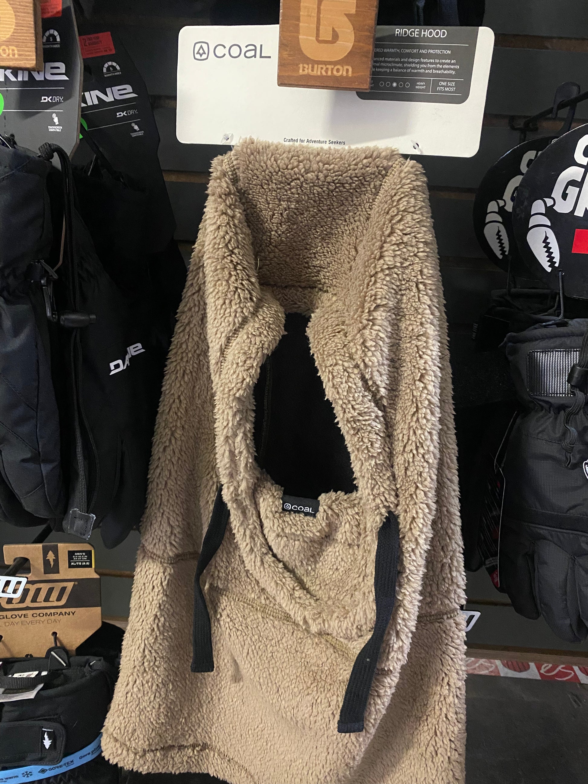 The Ridge Hood features a double-layer construction with an ultra-plush sherpa fleece outer and moisture-wicking mesh liner. Adjustable and helmet compatible, front panel covers the face.